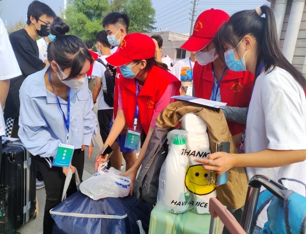 在公司北门迎新站点、员工宿舍摆渡车停靠站点,志愿者们不畏炎热,顶着烈日为新同学办理报到手续、搬运行李等,充分发扬了志愿者精神。为方便各位新生能尽快完成报到手续的办理,公司在北门及摆渡车停靠站点等设置标识牌、使用扩音器引导新生报到。同学们进入公司后,首先由志愿者接过行李张贴标签,同时引导他们刷脸、做核酸,最后带领新生乘坐校内摆渡车前往员工宿舍。志愿者们个个面带微笑,热情似火,在接待点与宿舍间不断往返以确保迎新生工作的顺利进行。