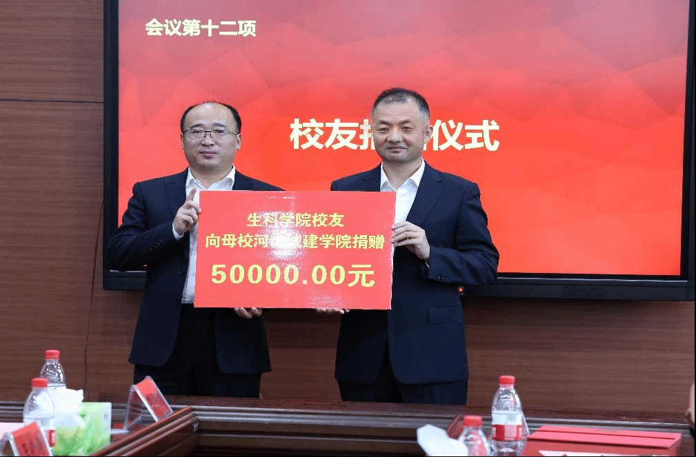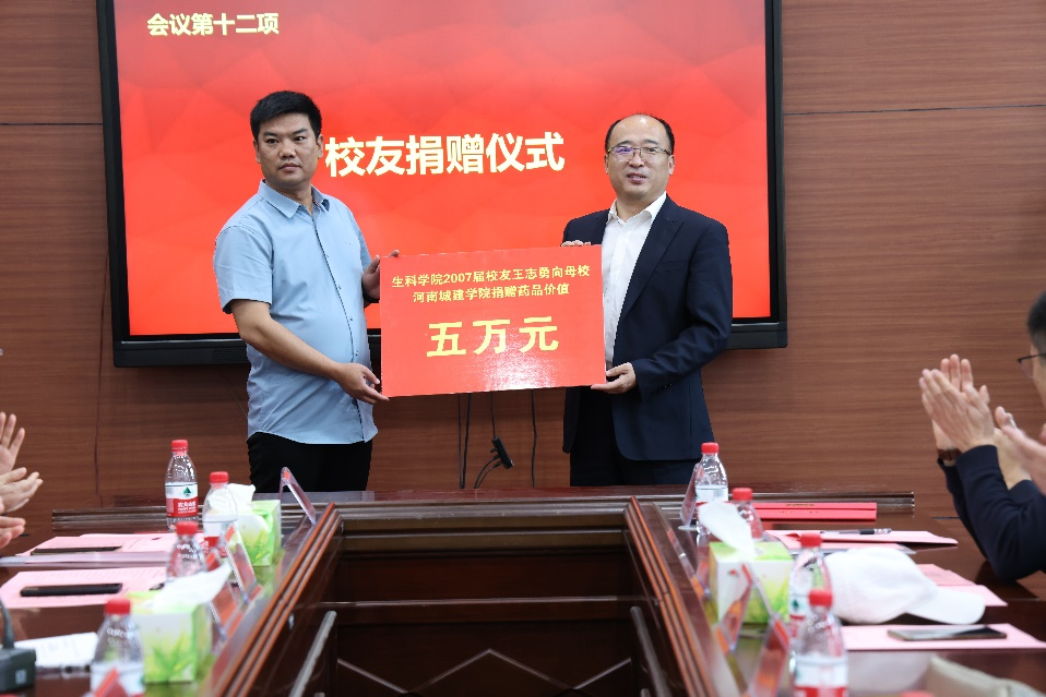 会后,平方剑代表员工向母校捐赠五万元资金,用于k1体育事业发展;王志勇员工向母校捐赠价值五万元的药品。闫继涛代表公司接受了捐赠。