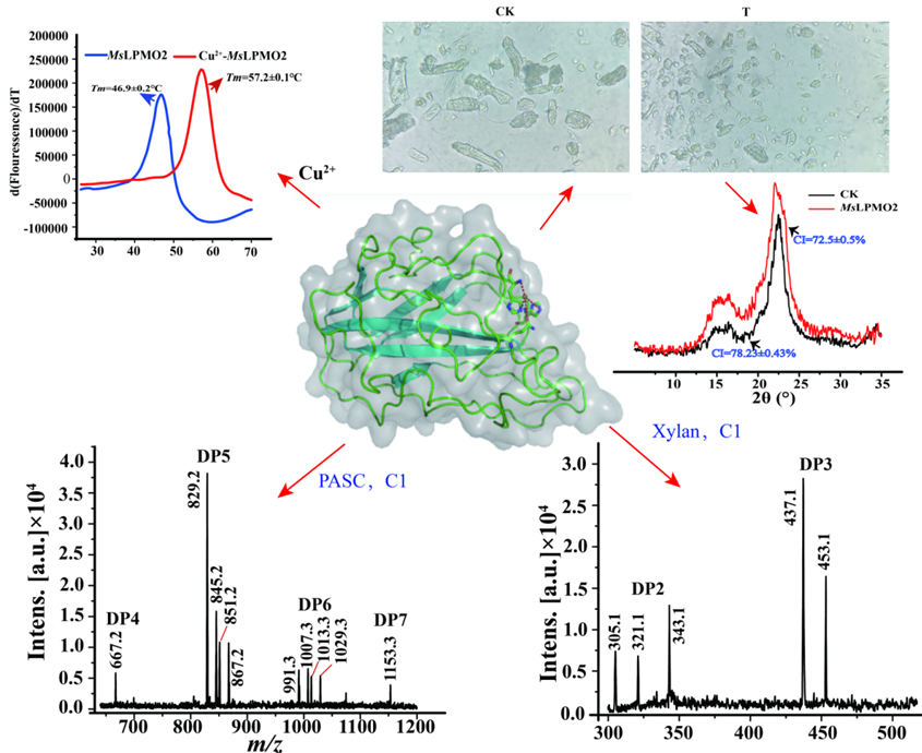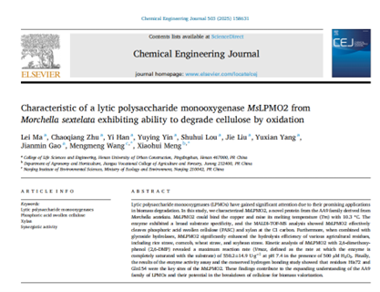 相关研究成果以“Characteristic of a lytic polysaccharide monooxygenase MsLPMO2 from Morchella sextelata exhibiting ability to degrade cellulose by oxidation为题,在线发表于国际知名学术期刊《Chemical Engineering Journal》(中科院Top期刊,IF=13.3),k1体育为第一单位,k1体育马磊博士为第一作者,高建民博士和公司本科生朱超强、韩艺、尹玉莹、娄淑慧、杨玉贤参与了研究。